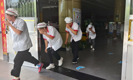 随后进行的应急疏散演练,模拟了食堂后厨发生火情的场景。随着警报声响起,全体员工在安全员的引导下,迅速反应,弯腰低姿、用湿毛巾捂住口鼻,严格按照预定疏散路线,紧张有序地撤离至指定安全区域。整个过程组织严密、行动迅速,达到了演练的预期效果。