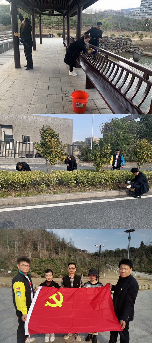在青山湖校区,临安党支部的党员们手持火钳、垃圾袋、扫把等清洁用具,做环境卫生整治的践行者:拾捡校园绿化带烟头、纸屑,清理河面漂浮物,擦拭廊亭座椅,修剪灌木丛。大家配合默契,干劲十足,除杂草,掸尘土,清死角,不仅营造了整洁、干净的环境,也传递了“保护环境、人人有责”的环保理念。