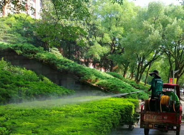 实施病虫害防治期间,环卫师傅起早摸黑,避开人流高峰,采用整体喷杀加局部重点治理的方式进行打药治虫。7月底至8月初,各个校区均进行了一次大规模的喷药治虫工作,8月中旬又组织了一次局部针对性治理,起到良好效果。