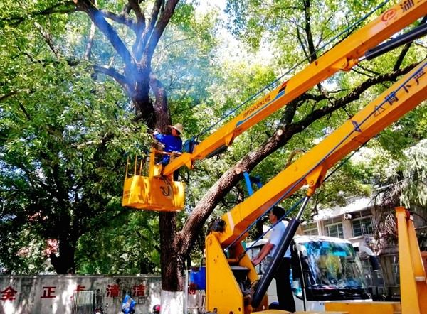 校内部分大树因枝条密集而伸入建筑物内部;还有的因生长环境受限,树干腐朽空心,濒临枯死。为消除安全隐患,启动暑期清枯除杂专项工程,各校区按照修剪工程量的大小和难易程度,因地制宜,对乔灌木进行整形修剪,对危树枯枝进行处理,同时对校园内大树进行加固。暑期共完成300余株大型乔木的整形修剪,有效防范了树枝高空坠落危险,整体提升了校园绿化品质。