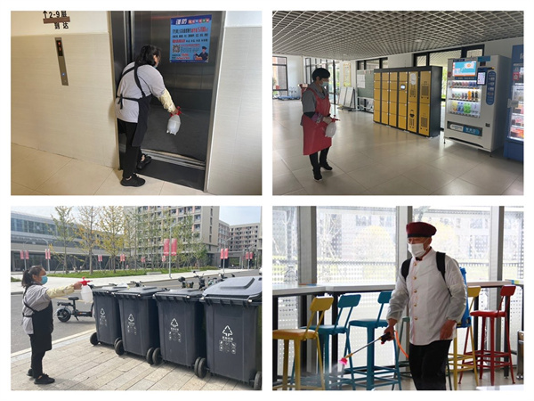 同时,后勤保洁人员加强公寓楼等场所的消杀力度。他们严格按照卫生消杀管理标准和操作规范,对公寓楼周边、公寓楼大厅、公寓楼垃圾回收箱周围、楼道公共区域等场所进行专业消杀,确保消毒消杀全覆盖、无死角,全面筑牢校园疫情防控屏障。