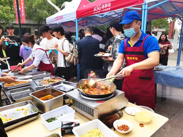 在活动现场,两家公司分别以“张家港本邦菜”和“淮扬菜”为风格,推出了“蟛蜞豆腐”“叫花鸡”“拖炉饼”等特色美食、小吃,得到师生的一致好评。在“成本核算”展示区,分别以“10元、12元、15元”为标准制作快餐,并列出原材料、配料等成本核算表,用实例向师生说明食堂菜价的组成。同时,两组厨师还在现场制作了“大盘鸡”“回锅肉”等大众菜肴。参加活动的学生对各个菜肴的色泽、口味、成型等进行品尝、评判,现场不时传来阵阵好评。由原材料供应商组成的美食一条街推出现场制作的炸鳕鱼排、扬州炒饭等各类美食、精致的小吃也吸引了众多师生光顾。