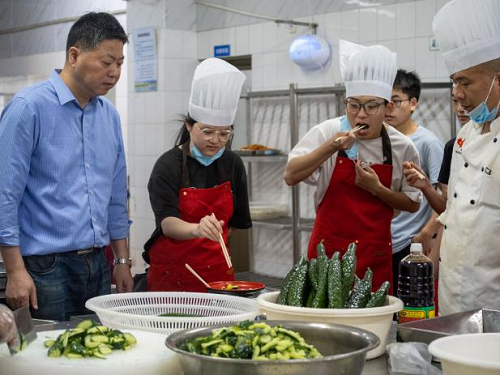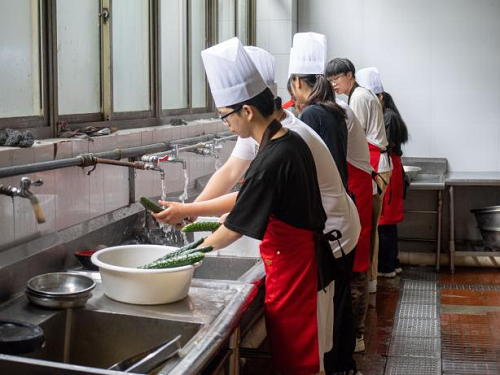 看着师傅们娴熟的刀工和手法,同学们跃跃欲试,在师傅们的指导下切身体验了一番。新鲜的食材往往只需要采用最朴素的烹饪方式,顶顶新鲜脆爽的黄瓜段只需用白糖、酱油、醋、蒜末、香油进行调味,一份让同学们赞不绝口的拍黄瓜就完成了。黄瓜炒蛋也是如此,黄瓜切片后加入鸡蛋简单翻炒,适当调味后就可以出锅了,清脆的黄瓜配上绵软的炒蛋,咸鲜清爽的口感也是让同学们放不下手中的筷子。