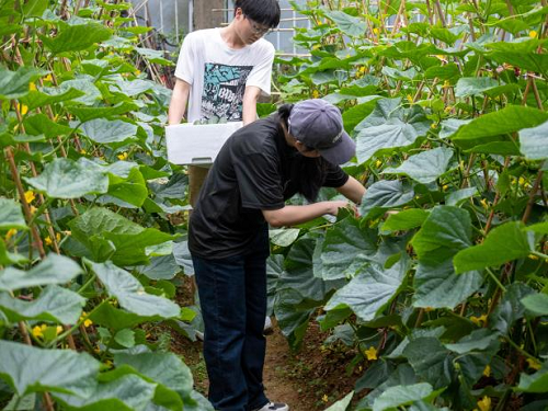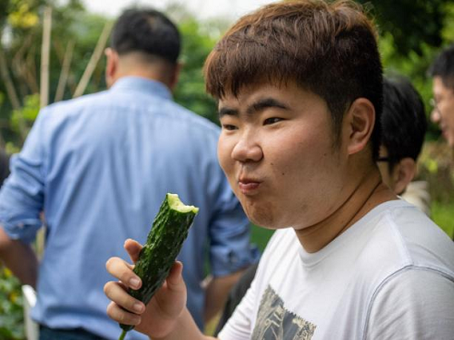 伴随着凉爽的微风,大家一同来到实践基地收获瓜果。一根根黄瓜挂满藤蔓枝头,翠绿诱人,清新的瓜香扑鼻而来,基地内生机勃勃。看到自己亲手种植的黄瓜,同学迫不及待地想要摘下品尝一番。在公共事务服务中心副主任陆松波的带领下大家纷纷动起手来。新鲜的黄瓜身上带着白刺,大家都惊呼扎手,却又不舍得放手,一时间园内欢声笑语不绝于耳,不久便摘了满满三箱,收获颇丰。