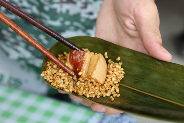 米香怡人,粽叶飘香,和园餐厅二楼,桌子上摆满了粽叶、糯米、肉馅、豆沙等食材。活动开始,和园餐厅主管现场解说了端午节包粽子的习俗由来及粽子的结构、花色等内容,同学们听了讲解,跃跃欲试。两位面点师现场演示教学,手把手向教官和同学们传授裹粽子技艺,从卷粽叶、添糯米到绑细线,开始时很多同学没有经验,会出现漏米,捆绑松散等情况,但通过反复的尝试,推倒重来,同学们虚心请教、相互学习、相互协作,一个个形态各异,大小不一的粽子很快装满了盆。