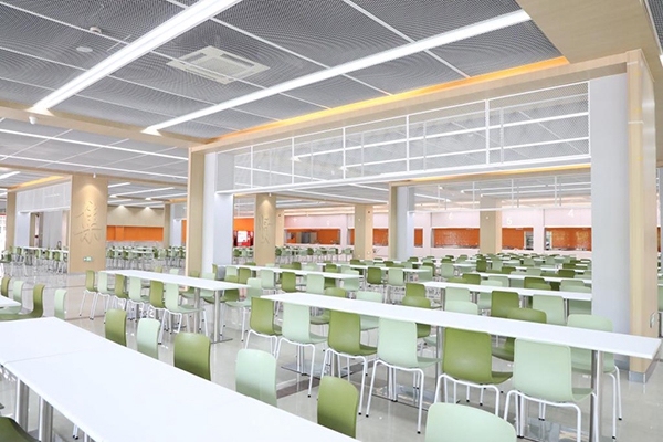 改造后的集贤食堂突破传统的大伙食堂设计理念,融入色彩感、时尚感、现代感元素和“集贤”文化元素,实现课堂、食堂、讲堂三合一,满足学生就餐、学习、会议、研讨、社团活动等多种功能需求。改造后的集贤食堂大厅宽敞明亮,以亮橙色为主基调,具有温暖、欢快、健康、热情的独有风格和气质。大厅桌椅选用明快简洁的配色,以不同风格的桌椅和灯饰实现快餐区、卡座区、休闲区的功能分区,整体环境现代、清新而富有文化气息。