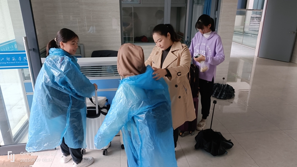 中秋佳节,暖心一幕,宿管老师为2023级“小萌新”整理穿戴雨衣。9月29日,农历八月十五,中国传统节日“中秋节”,室外阴雨绵绵,略有些凉意,但夏荷楼学生公寓2号门值班的宿管老师与2023级“小萌新”的暖心一幕,让笔者感到暖暖的、很贴心。“同学,这会儿雨下得比较大,穿好雨衣,我来帮你整理一下。”宿管老师赵启永暖心地和离校回家的学生说着,动作麻利的一边整理雨衣、一边帮助她扣好雨衣的按扣。这一幕,感动着我,也感动着离校回家的学生。“谢谢阿姨、谢谢老师!祝你们节日快乐!”我们彼此互致问候。