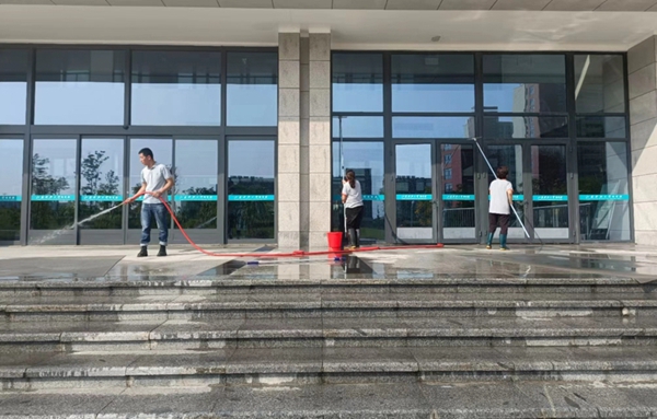 开展校园环境卫生全面清洁。正值初秋,树木落叶骤增,物业中心集中力量对绿化带内积存的落叶进行彻底清除,增加循环保洁的频次,确保路面垃圾杂物随落随清。对教学楼、图书馆、办公楼宇进行地毯式清洁,包括除尘,门窗擦拭,雨水管、排水沟、下水道清理,污渍清洗等。同时,对梦溪校区综合楼、教三等老旧建筑物的墙体进行清洗,对玉兰池等标志性景观进行深度清洁,对足球场、体育馆周围、垃圾房、花坛周边、地下车库等区域的卫生死角进行集中清理。整洁、优美的校园环境让人心旷神怡。