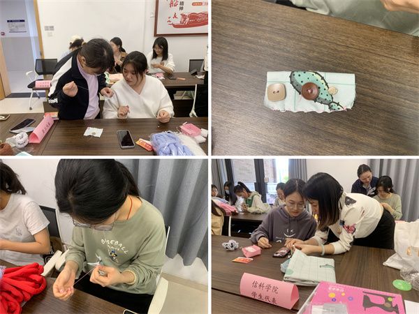 活动现场,公寓服务部主任、校级“巾帼文明岗”培育岗岗长周彩虹对同学们的到来表示欢迎,她向同学们介绍手工缝补既是一种艺术形式,也是一项生活技能,可以帮助我们修复衣服和家居用品,同时能表达我们的创意和个性。紧接着,全体成员在阿姨们的带领下了解了手工缝补的基础步骤,穿针引线、平针回针、布料缝合、钉纽扣……同学们热情高涨、积极实践、相互学习,现场气氛热烈、互动活跃。随后,阿姨们通过自己的奇思妙想和巧手改造,向同学们展示了如何利用旧衣物制作出一个小抱枕,并带领同学们用旧毛巾、快递泡沫垫等材料缝制凳脚包。活动最后,同学们进行了现场DIY,制作了爱心抱枕、手工包包、甜甜圈靠枕等手工艺品。