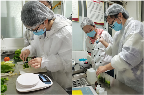 上午10:00,菜品售卖留样、餐具消毒清洗“体验官”穿戴好工作服,做好安全消毒措施,在食堂工作人员的指导下,严格遵守安全规范和工作流程,进行食材检测体验和餐具清洗体验。