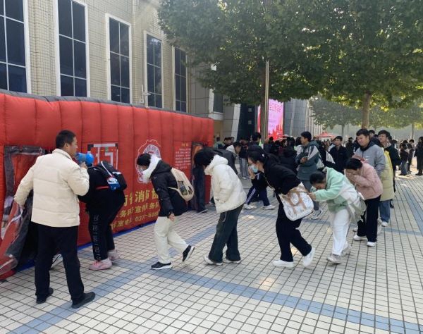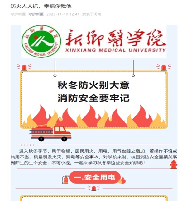组织形式多样的消防宣传活动。积极开展线上消防安全宣传。通过“守护新医”微信公众号平台,推送消防安全知识和消防器材使用方法,鼓励师生间转发、点评,扩大宣传覆盖面。认真组织线下消防安全培训。按照《2023年消防安全培训工作方案》,11月份持续开展消防安全培训10场次,培训师生560余人。通过教官专业讲解消防器材使用方法、火灾自救与互救逃生技能,广大师生消防安全素质得到锻炼提高;举办新乡医学院第一届消防趣味运动会,设穿越火线、密室逃生、水带链接接力等比赛项目,全校各书院、学院选派158名师生参加,参赛队员实际锻炼了逃生技能、消防救援本领,师生观众也受益匪浅。营造浓厚的消防宣传氛围。通过悬挂“关注消防 生命至上”主题条幅,展出展板,发放宣传册页,大力营造宣传氛围,设置留言条幅,鼓励学生写下对祖国消防事业或消防员的祝福语并签名;播放校园消防安全宣讲视频,讲解火灾的成因和防范措施、消防器材的日常使用和维护、火灾自救与互救逃生技能等知识。