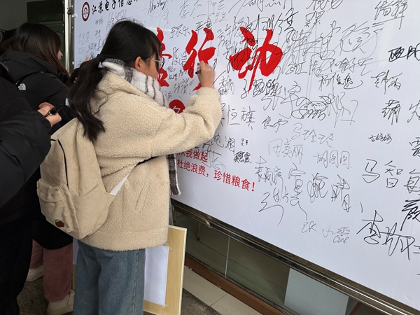 餐厅门口放置“光盘行动”签名墙,来往师生在墙上签上自己的名字,承诺自觉践行“光盘行动”的宗旨,在日常生活中养成珍惜粮食、厉行节俭的好习惯。