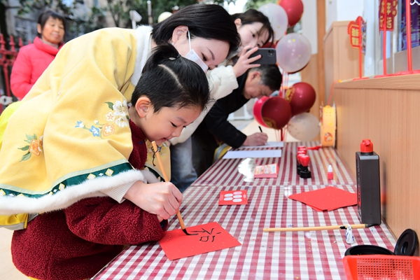 新年到,祝福到,幼儿园里真热闹。萌娃们纷纷穿上红色新年服,与家长们兴趣盎然地“画福”“写福”……孩子们伸出小手,握住笔杆,有模有样地“画”着一张张新年“福”字,书画一笔浓浓的年味,传承源远流长的民俗文化,与爸爸妈妈一起将福字挂在“许愿墙”上,“打卡”许愿新的一年里健康快乐地成长。