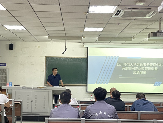 为落实四川省政府、省教育厅关于有限空间作业安全防护提出的要求,提升员工以及第三方维保单位的安全防范意识和应急处理能力,近日,四川师范大学后勤服务管理中心在狮子山校区组织了一场有限空间安全防护教育培训会暨应急演练。此次培训特别邀请了四川师大社区党委书记兼居委会主任毛永忠作主讲,后勤服务管理中心下属质量安全部、饮食保障部、绿化环卫部、物流服务部、能源通讯部相关管理人员以及高压、电梯、泵房、水池清洗、化粪池清掏维保单位作业负责人到场参加。