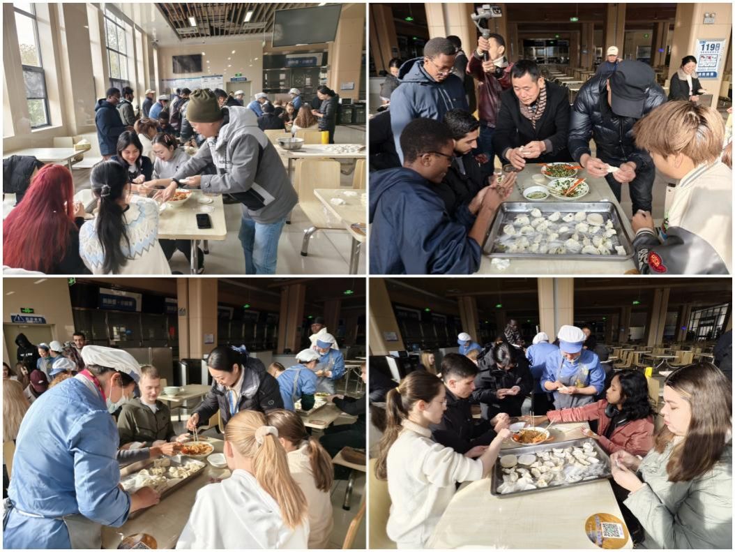 党员同志们也纷纷加入其中,手把手耐心教授同学们如何揉面、如何擀皮、如何捏褶,虽然语言不通,但这一刻大家的心与心连在一起,消融了文化的隔阂。大家忙得不亦乐乎,场面热闹而温馨;他们虽然手法生疏,但那份对美食的热爱和对文化的尊重却溢于言表。