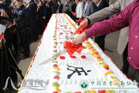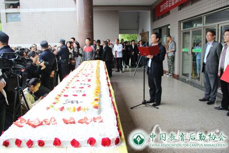 校庆日,杏园餐厅西门口人头攒动,惊叹声连连:“哇,好长的蛋糕!”只见食堂糕点师正在从容不迫地制作6米长60周年校庆蛋糕,经过一个小时的现场制作,“浙江师范大学六十周年校庆”“浙师之窗”等文字、标志……六米蛋糕在同学们的热情围观之下“新鲜出炉”,与此同时,2016年后勤保障优质服务系列活动启动仪式正式开始。副校长张根福出席仪式并致辞。校办、学生处、研工部、公管处、保卫处、团委等有关部门负责人、后勤集团领导班子成员出席仪式。