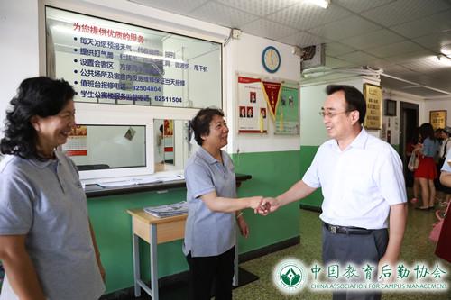 后勤集团总经理林建荣介绍了后勤集团迎新工作的准备情况和今年工作的新亮点,学校领导对后勤员工不辞辛苦、加班加点完成迎新任务的努力表示慰问和感谢,对后勤集团为给学生提供更加温馨舒适的生活学习环境所做出的一系列努力给予充分肯定和称赞。后勤集团党委书记兼副总经理冯诗松、副总经理杨建国、副总经理赵淑慧、党委副书记兼副总经理孟林陪同。