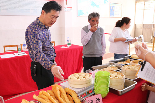 本赛项分两个环节进行,九位参赛选手须在规定时间内完成指定白案产品和自选产品,主要考察选手油条、大饼、小笼包的手工制作工艺,以味感、质感、观感、营养卫生等四个方面为标准,对选手技术进行全面、公正的考评。