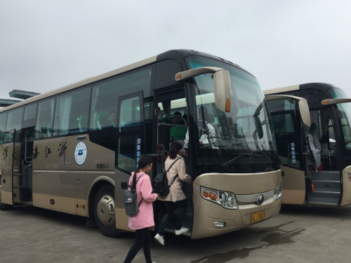 因教学任务的安排,每个周末4个学院的几百名学生从定海校区前往新城校区上课,交通服务中心理所当然地承担起接送学生的任务。从早上7点半至晚上9点,交通中心6辆大巴车每辆车一天需往返两个校区6趟。早晨,笔者来到定海校区,离发车时间还有15分钟,交通中心的驾驶员已早早在校门口带车等候。等候学生来的间隙,驾驶员也不闲着,打开车窗通风,给车里的垃圾桶套上垃圾袋。临近发车时间,学生陆续上车,驾驶员站在车前提醒学生以班级为单位乘坐,上车后提醒班长点名,下车不要落下东西。从定海校区到新城校区只有短短的15公里,等第一批学生上完课把他们送回去,然后接第二批学生,再接第三批。开车的时间虽短,然而等待的时间却很长,开末班的驾驶员常常得等到晚上9点才能回去。