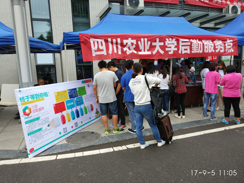 后勤,后勤,也重于情。现场设立后勤服务点,免费为新生提供面包、牛奶和水等,前来领取的新生络绎不绝;宿舍、校医院设立“家长休息区”专区,宿舍管理员深夜值班只为等候晚到的新生。食堂延长就餐时间至晚上22:00,随时为新生和家长送上热腾腾的饭菜,并设立临时餐券售票处,方便还未办理一卡通的新生;动力及修缮科延长开水房和浴室供应时间,维修人员随时蹲点待命,启用突发停电应急预案确保新生报到期间的水电供应,保证宿舍突发维修及时到位;校园超市为新生们提供了急需的各类生活用具和日化商品。雅安校区宿舍得知生命科学院来了一位身高2米的胡同学时,就立即行动赶在新生报道前对床尾加长32cm,“量身”打造了2.23米的特制大床,对床上用品进行了拼接改造,并第一时间联系厂家定制加长版棉絮,联确保他在寝室住的“舒适”。校园超市冒雨为新生送货上寝,赢得新生谢意连连。校医院新生体检服务由08:00持续到21:00,免费提供藿香正气水。为了加强宣传和沟通力度,共同创造和谐的校园后勤,我们开通了微信订阅号,在体检处设立专门后勤服务点,运用抽奖等参与式活动,向学生和家长们介绍学校的后勤服务,吸引了不少新老生及家长纷纷关注。在成都校区,学生浴室供应从下午15:30到凌晨01:00,开水房全天开放,提供不“打烊”服务;在都江堰校区,后勤服务点“爱心物品领取处”的小桌子、水瓶、衣架、书籍等十几种生活和学习用品,吸引了不少新同学来免费领取,深得好评。