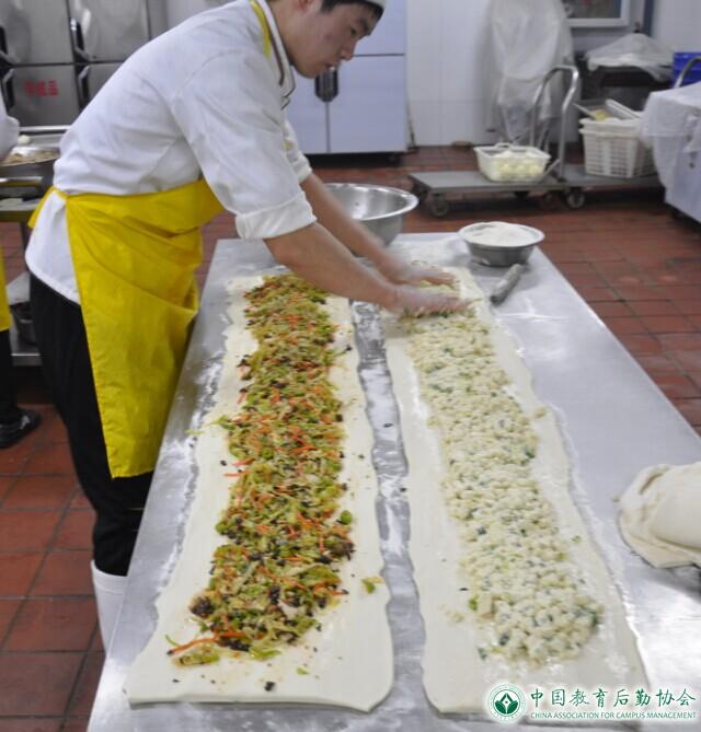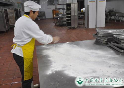 与此同时,在厨房里,工作人员将面粉磨匀,把前一天晚上调制好的包子、馅饼的馅料从保鲜室取出。