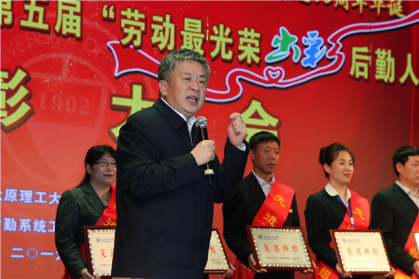 吴玉程发表重要讲话,他指出,太原理工大学后勤职工辛勤劳动、默默奉献,争当一流,走在了全省高校后勤工作的前列,为学校学科建设、人才引用、教学科研、学生工作、师生生活提供了坚实有力的后勤保障服务,是学校发展建设的幕后英雄,是理工建设最可爱的人,我为后勤战线上的全体后勤职工们点赞。他强调,今年是新中国成立70周年,也是我校“双一流”建设奋力冲刺的关键一年,全体后勤职工要大力弘扬劳模精神,发扬工匠精神,厚植奋斗理念,展现劳动情怀,改革创新、奋发有为、勠力同心,追梦奋斗,用辛勤和智慧打造一流的后勤服务保障,助力学校实现建设中国特色“双一流”大学的宏伟梦想。