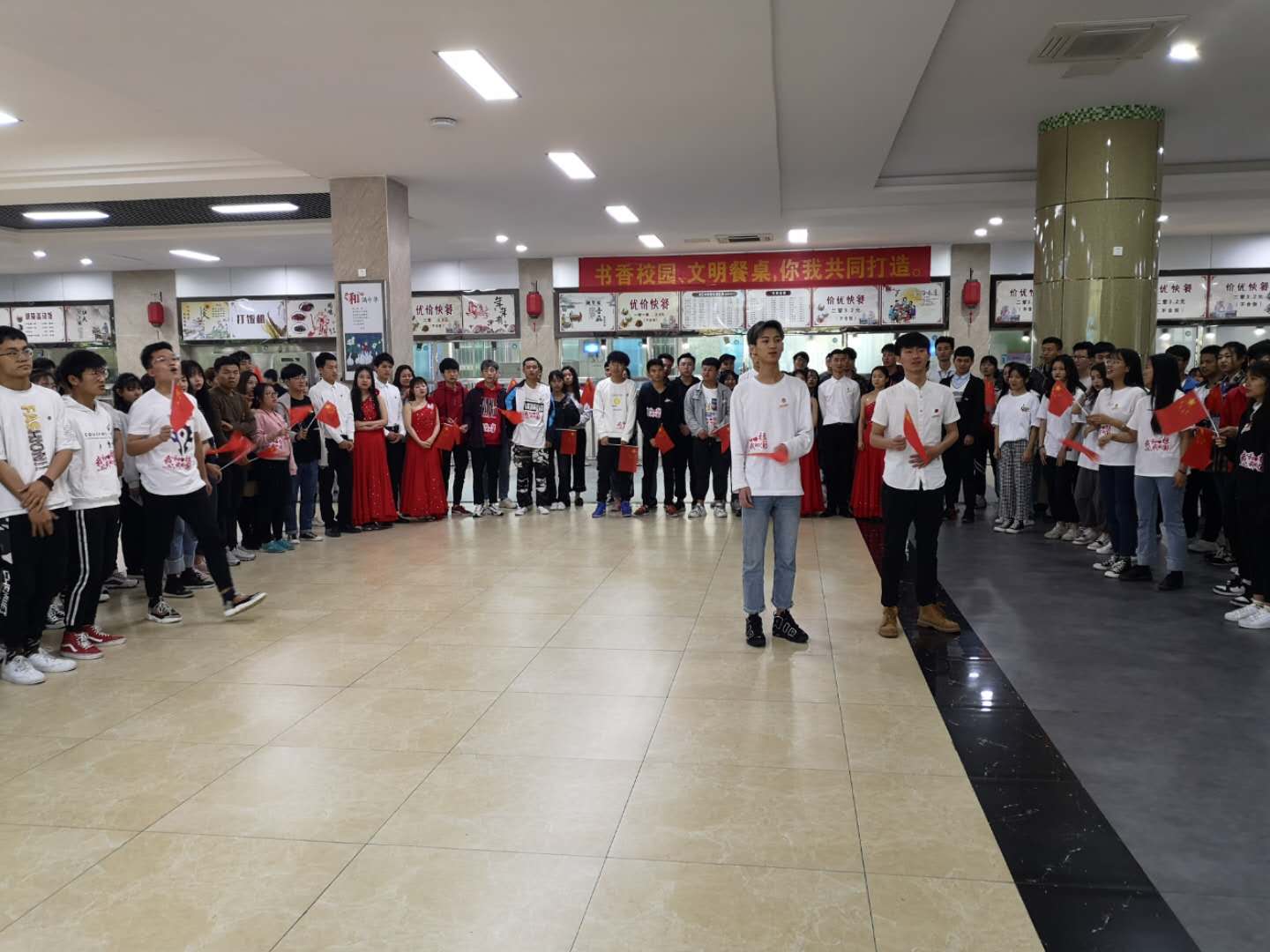 11点30分用餐高峰,涌入学校食堂的师生越来越多,由团委学生干部组成的快闪队伍在短时间里井然排列。突然,悠扬的小提琴奏响起,正在排队打饭的师生纷纷靠拢过来。《我爱你中国》歌曲传唱开来,青春的街舞亮出动人的街拍,悠扬的国标掀起红色的裙浪。现场瞬间一片沸腾,正在食堂吃饭的很多学生被这热闹的气氛所感染,不约而同地放下筷子,也纷纷伴着欢快的节拍,打起节奏唱起歌来。整个“快闪”表演持续了10分钟左右,一曲唱罢,表演者散去,食堂又恢复了平静,只留下数百名路过此处意犹未尽的老师和同学们。待大家缓过神来,才知道快闪活动是后勤管理处联合校团委开展的,“五四青年节快到了,为了迎接和庆祝这个属于年轻人的节日,校团委和后勤饮服中心组织和策划这场青春的快闪活动。主办方希望用当代大学生喜闻乐见的形式,引导和激励青年学子纪念五四运动100周年,铭记光荣历史,发扬五四精神,彰显青春活力,矢志成长成才。