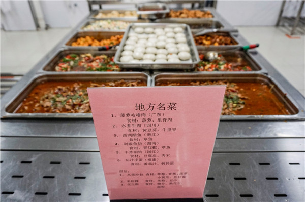 饭点一到,窗口便摆出了色香味俱全的“乡宴”架势:菠萝咕嘟肉酸甜诱人,水煮牛肉鲜辣入味,干炸响铃香脆可口,还有西湖醋鱼、剁椒鱼块、茄汁虎皮蛋。除了选出的6样菜品外,食堂还专门准备了水果沙拉、米粉粿和花生酥,希望给大家添一道饭后甜品。同学们拿着“爱的号码牌”陆续前来兑换,言语间涌动着快乐的音符,也深深感染了窗口服务的“后勤人”。