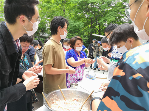 5月6日正值立夏,立夏过后,天气将告别春天开始进入夏天了,就像我们的毕业生即将离开母校踏上人生的新征程。当天两楼的工作人员一大早就忙活开了,一边为同学们准备了各色瓜果糕点,一边忙不停蹄的布置现场。这届18#楼毕业生是汤阿姨亲手迎进公寓的,感情更是没的说。这期的美食人生课上汤阿姨特意给学生带去了用心烹制的乌米饭、立夏豌豆饭,希望同学们吃了立夏饭,在接下去的人生中都能平平安安、健健康康。随后汤阿姨和工作人员一起为同学们开展了“远志”水饺的现场教学。很多同学都是第一次尝试包水饺,有同学说道:当看到一个个歪歪扭扭的水饺在自己手中诞生,这种成就感并不亚于拿到烫金的大红奖状。现场人流熙熙攘攘好不热闹,两个楼的毕业生争相在现场拍照和阿姨们留影。大家一边吃着美食,一边和阿姨们一起回忆过往的美好时光,好一派其乐融融的景象。
