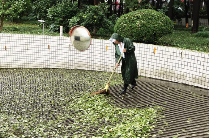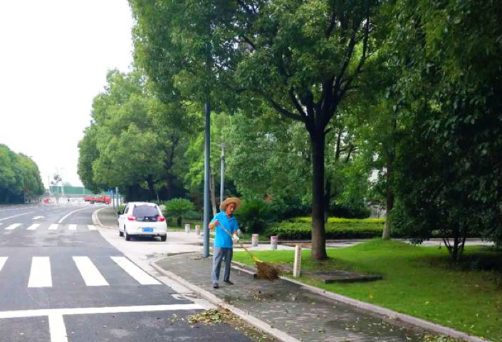 物业管理服务中心保洁部梁林校区马路工顾泉荣,在每天暴雨的情况下,冒雨认真清扫校园道路,特别是教学楼宇地下车库出入通道口的落叶。顾师傅说,“这里是老师学生每天进出停放车辆的必经通道,下雨天落叶湿滑很不安全,一定要清扫干净了,这样我也放心。”