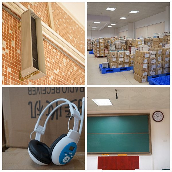 打铃联网系统、 教材室、 新生听力耳机、 教师吊顶话筒和标准化时钟