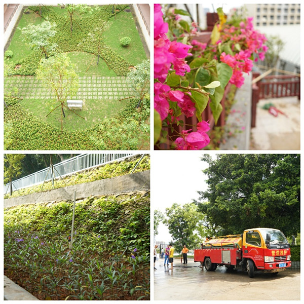 教学楼内庭、 山顶足球场附近绿化改造、 山底足球场边坡、 高压冲水车冲刷地面