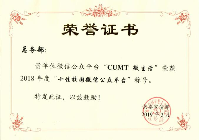 在今年上半年开展的2018年度校园新媒体评选活动中,总务部官方微信公众平台“CUMT微生活”获得“十佳校园微信公众平台”荣誉称号。这是从2017年起,“CUMT微生活”连续两次从全校近30个微信公众平台中脱颖而出获得此项荣誉称号。