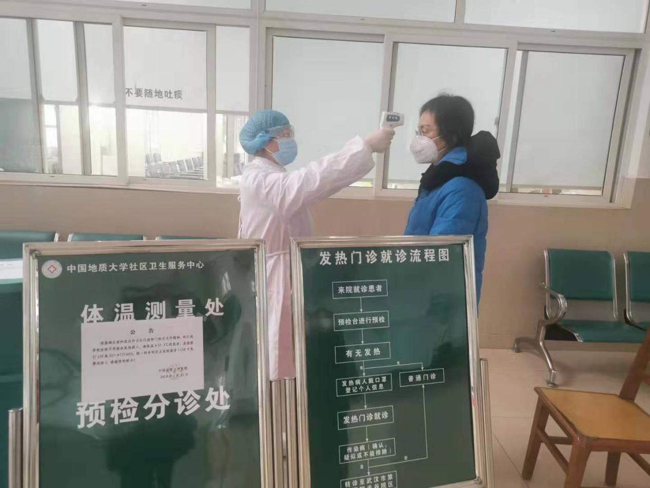 学校统筹做好南望山校区、未来城校区和汉口社区医疗点医护工作。在南望山校区医院设立预检分诊台,严格遵守首诊负责制;在医院住院部一楼设立发热门诊,安排专人负责接诊发热患者;完善门诊接诊工作规程、医务人员防护规定;密切关注疫情变化,及时掌握和报告预检分诊和发热门诊就诊情况。