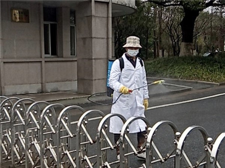 物业服务中心环境管理部绿化养护工陈海根:一直以来,我都是负责绿化养护工作,疫情来了,我也总想着能为学校做点什么。于是,我主动承担起行政楼、教师公寓和直运垃圾桶的每天消毒工作。每次消毒我们要肩背50多斤的消毒桶,每天消毒面积10000多平方米,喷洒量达500余升,不留死角,只要疫情一天不解除,我们就一天不放松。现在每天上下班,我都会量体温,这不仅是对自己负责,也是对大家负责。同时还要感谢家人支持和理解,能得到大家的肯定我很开心。