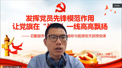 西南石油大学后勤各支部书记围绕战“疫”主题,结合支部工作、党员实际,开展微党课。如:餐饮服务与商贸党支部书记窦雪锋以“后勤不‘落后’、抗疫勇带头”为主题,重点讲了疫情就是命令、防控就是责任;学校党委决策快、基层组织响应疾;疫情大考需战斗、中共党员勇带头;后勤保障暖人心、用心服务见真情;返校离校时间紧、多重举措好评多。展现了所在支部工作在防疫一线党员冯泽辉、戴勇、罗兴余,职工叶泽彬、王伟等为保障在校5000余名师生、家属开设“平价菜市”、增设“留学生食品原材料采购窗口”、供应“水果、米面油”等基本生活用品,提供暖心服务的战“疫”事迹。