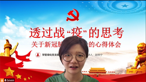 学管与绿化环卫党支部书记赵琦宁以“透过战‘疫’的思考”为主题,重点讲了透过战“疫”的烽烟,我们应当看到什么?对接战“疫”的进程,我们应当做什么?直面未来的战场,我们应该做些什么?物管及维修与能源中心党支部书记徐鹏飞以“发挥党员先锋模范作用、让党旗在战‘疫’一线高高飘扬”为题,重点谈了深刻领会什么是共产党人的先锋模范作用,战“疫”一线对党员先锋模范作用的要求,战“疫”一线如何发挥党员先锋模范作用。带领支部全体党员一起思考,增强对党、对我国制度优越性的认识和自信心,增强党员的党性观念、责任担当,积极做好后勤防疫和服务保障工作。(西南石油大学后勤)