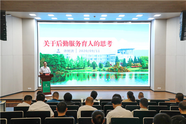 许树洪,人力资源部主任、网络与信息化部主任王筱洁分别作题为《关于后勤服务育人的思考》《打造一流后勤人才队伍的思考》的主题讲座。