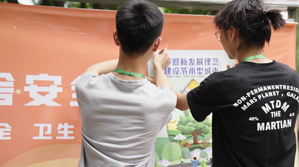 节能志愿者代表在宿舍区张贴节水宣传海报