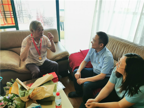 6月22日、23日,杭州师范大学后勤党委书记岑建旭、党委委员张华松分别走访慰问了3位“在党50年”的后勤老党员,为他们送去了组织的问候和关怀,并颁发“光荣在党50年”纪念章。