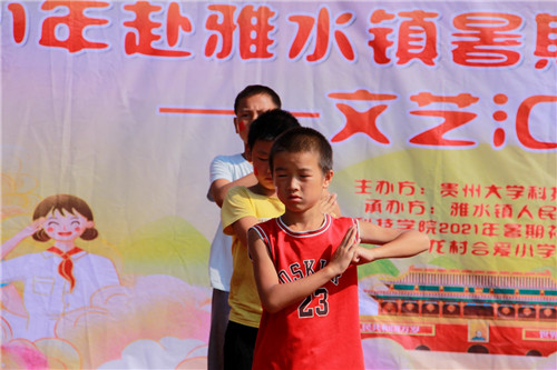 时间渺渺,若白驹过隙。贵州大学科技学院“科院情·励志行·中国梦”三下乡暑期社会实践服务团为期十天的社会实践已经接近尾声,为了给朝夕相处了十天的孩子们一个珍贵的回忆。7月28日上午,贵州大学科技学院暑期社会实践团在雅水镇合爱小学举办“永远跟党走,奋进新时代”为主题的文艺汇演活动。