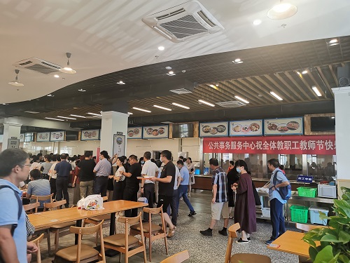 活动前期,公共事务服务中心精心准备,制作了教师节活动宣传海报,在教工餐厅悬挂了“祝福全体教职工教师节快乐”的横幅,营造浓厚的节日气氛。教师节当天,公共事务服务中心为前往食堂就餐的教职工们送上了一份印有“老师,您辛苦啦!”的精美礼物,并致以温馨的节日祝福。