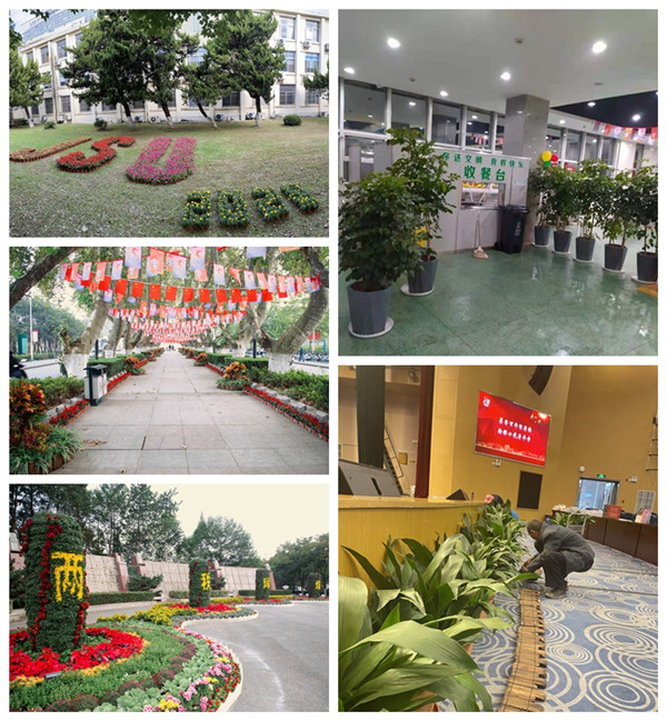 绿化卫生中心认真做好重点区域绿植的精修剪,道路卫生部员工以饱满的热情全天候确保校园道路的干净整洁,加强对绿化带断枝落叶的清理,更新了校内花坛、花镜绿地草花,在新大门布置了“百年芬芳 两秩辉煌”花柱,五棵松设计摆放了花境、静湖旁安放了花坛,确保校园焕然一新,有力保障了主要场馆(体育馆、图书馆、小礼堂)、各学院(材料学院、化工学院、理学院)会场相关庆典工作。