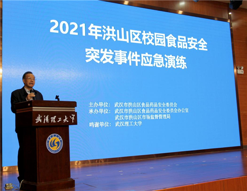 10月29日,武汉市洪山区2021年校园食品安全突发事件应急演练活动在武汉理工大学南湖校区南院举行,校党委副书记夏江敬、武汉市市场监督管理局餐饮服务监督管理处处长王晓东、洪山区副区长金龙,洪山区市场监督管理局、区委宣传部、区大学之城办、区卫健局负责人,洪山区30余所高校后勤部门负责人、媒体记者及学校学工部、产业集团、后勤集团、医院负责人等100余人参加了活动。